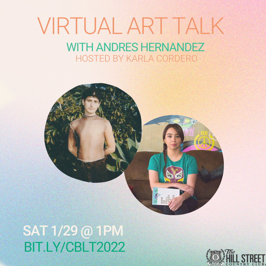 Join us Saturday, January 29th at 1pm @ via Zoom and get to know our current exhibiting artist Andres Hernandez as she’s interviewed by published Poet and professor Karla Cordero