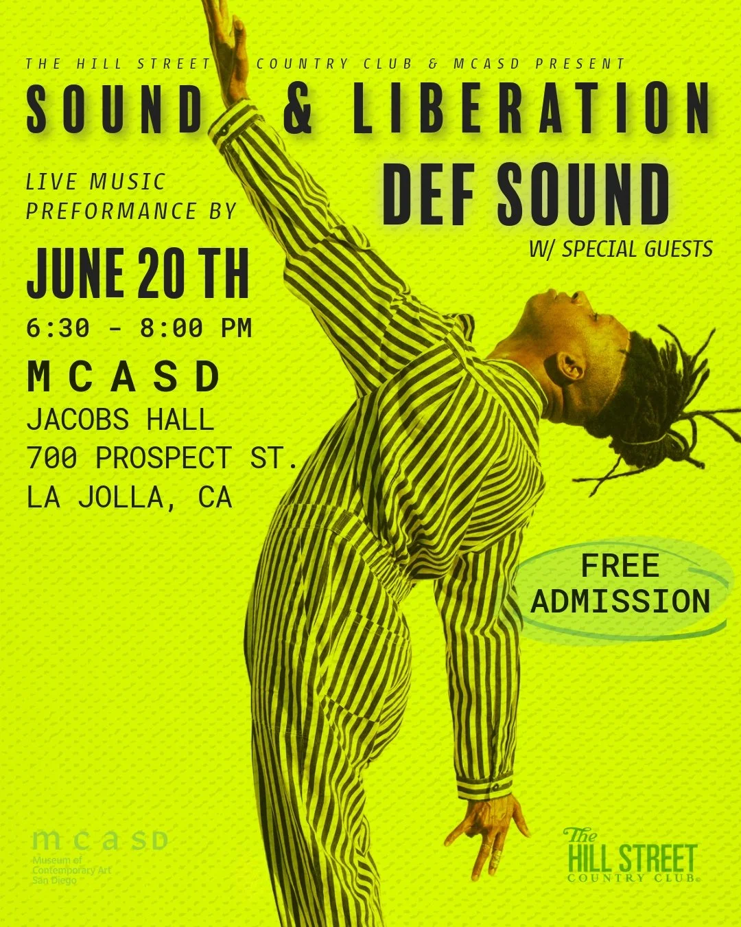 [La Jolla, CA] Join us at the Museum of Contemporary Art San Diego Thursday, June 20th from 6:30- 8:00 pm for Sound + Liberation, a live performance series developed by the Hill Street Country Club. Through this collaboration, HSCC and MCASD are proud to host Afro-Caribbean conceptual word artist Def Sound and invite guests to experience an intentional, intimate gathering offering, “music as medicine.”